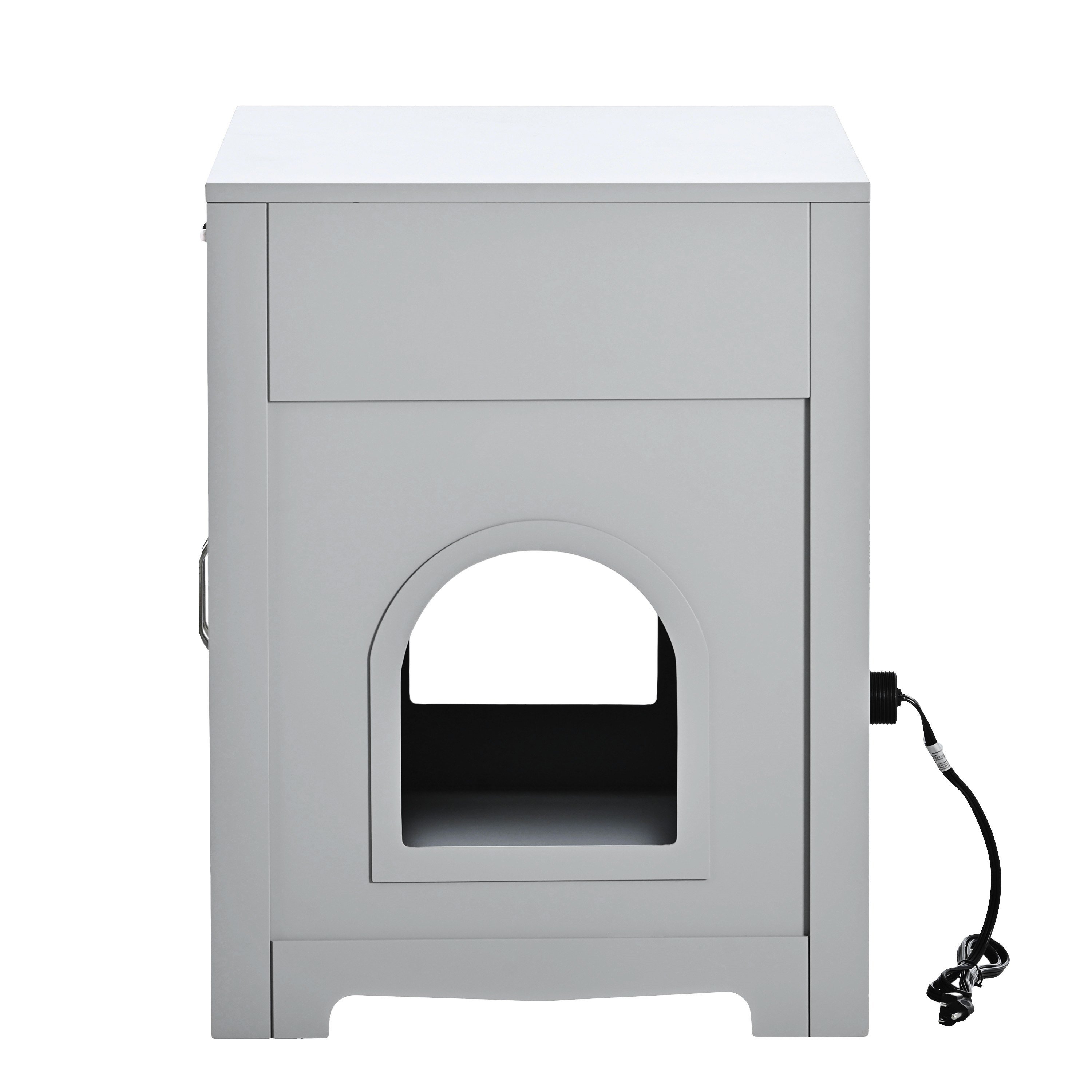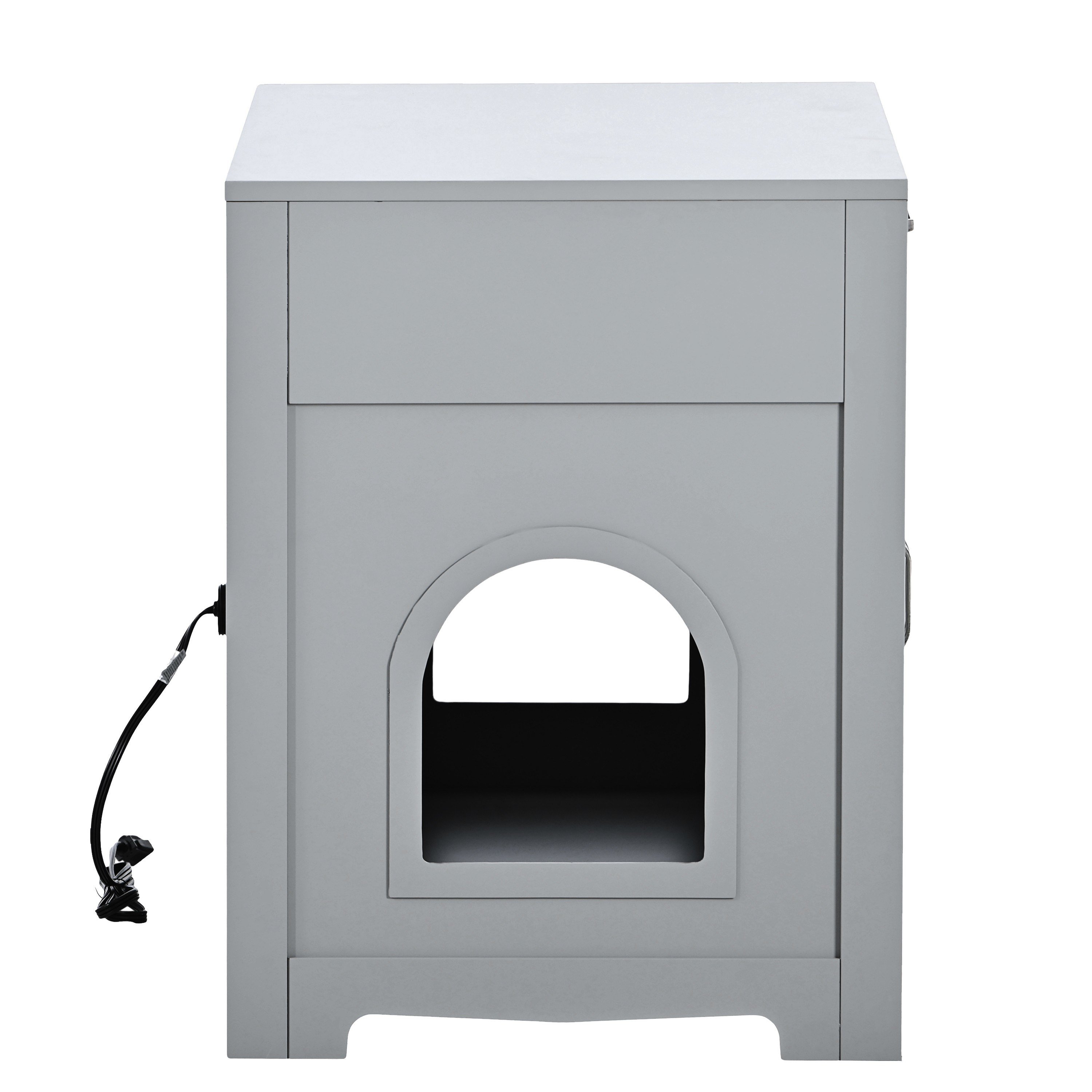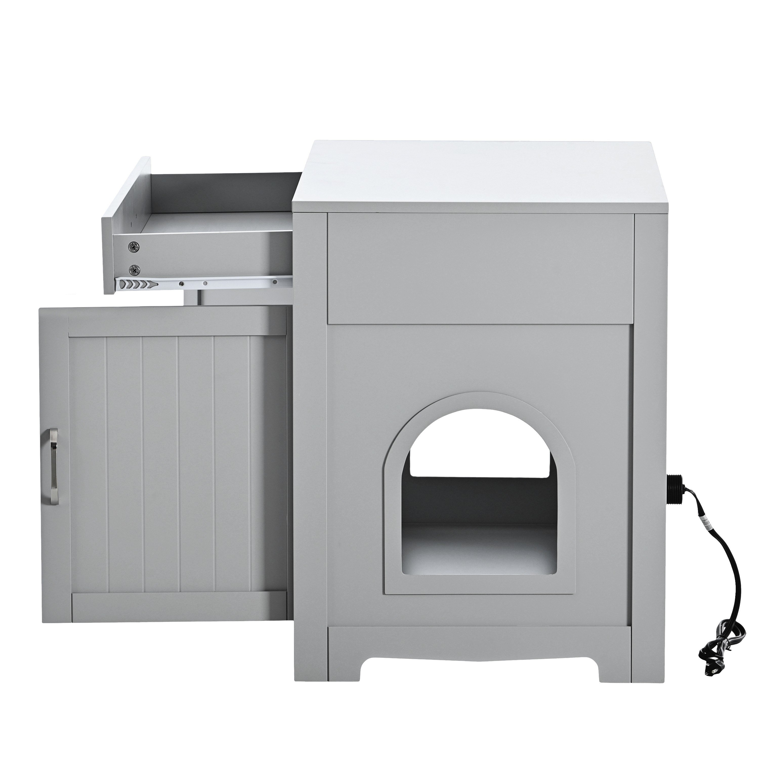 2.A Wide Tabletop and Seperate Appartment:This cat house has 2 doors with one big drawer, you can put Cat's snacks and toys in the drawer or the tabletop. With plug inside, you may put a air purifier to clear the air to give your cat conformation home.