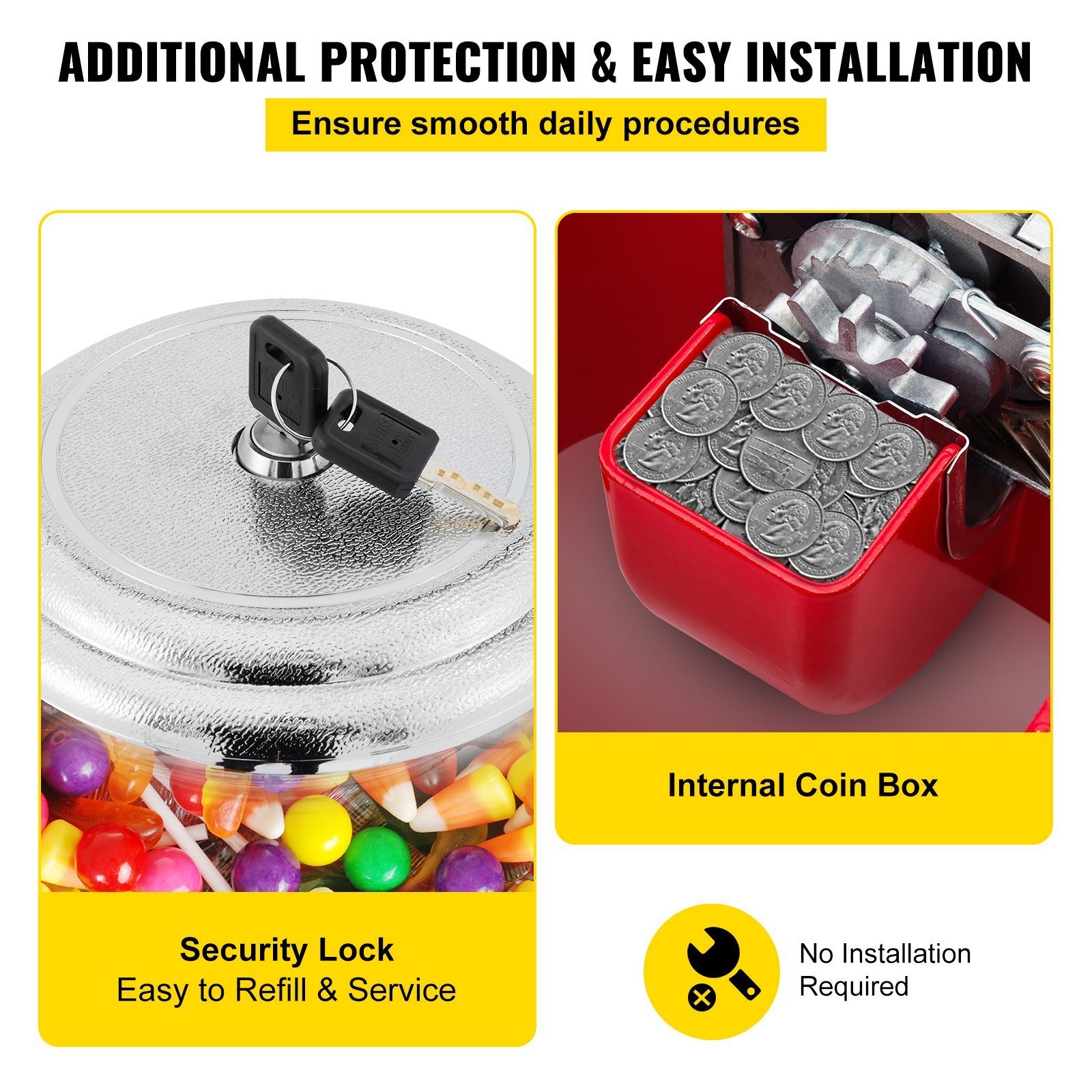 4.Security Locks: The candy machine is equipped with 2 keys on the lid for security. A one-piece lid facilitates replenishment. The coin box is inside, providing easy access and maintenance.